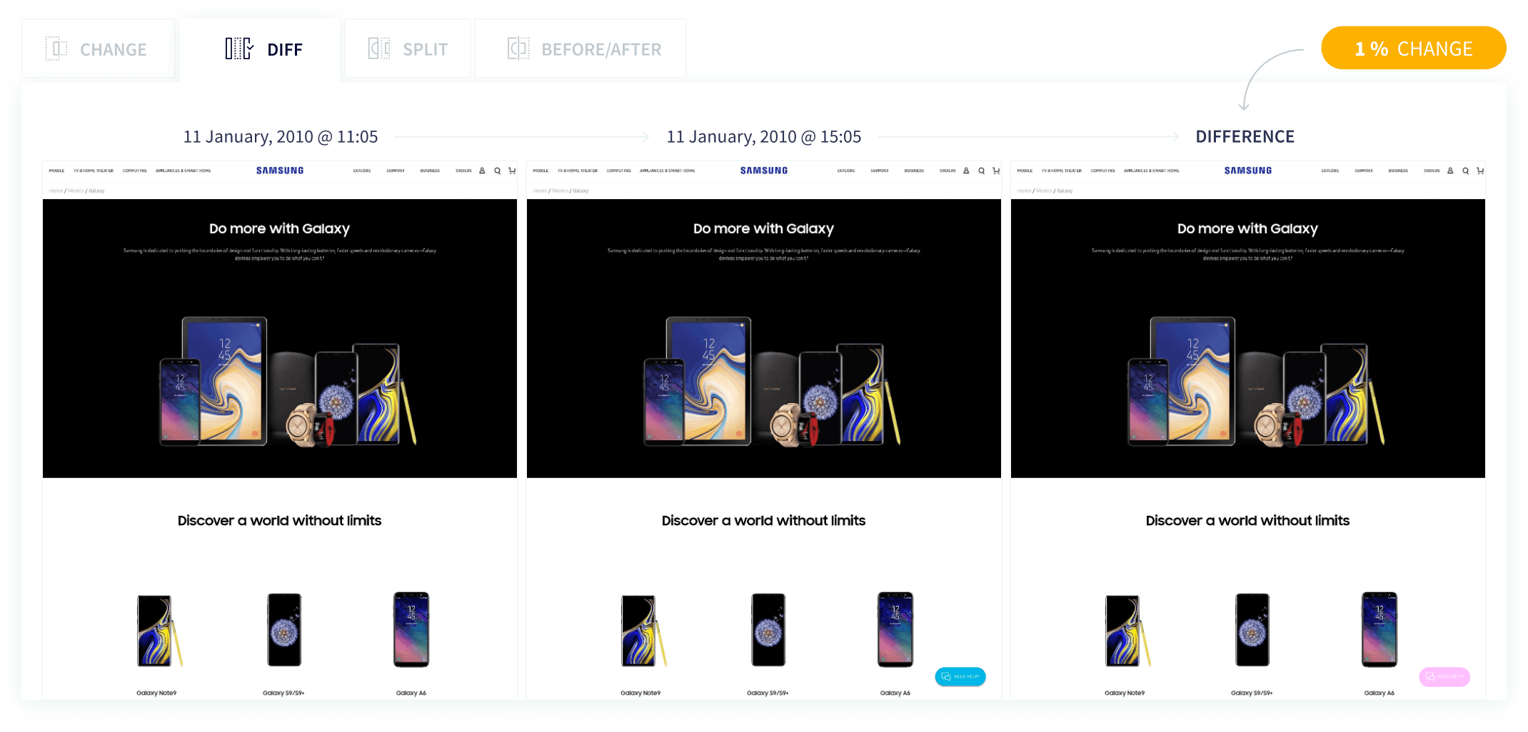 Identify the visual evolution of an entire web page without any effort. Understand the strategy behind your competitor last move. Get real-time information to adjust your messaging and content strategy accordingly.
